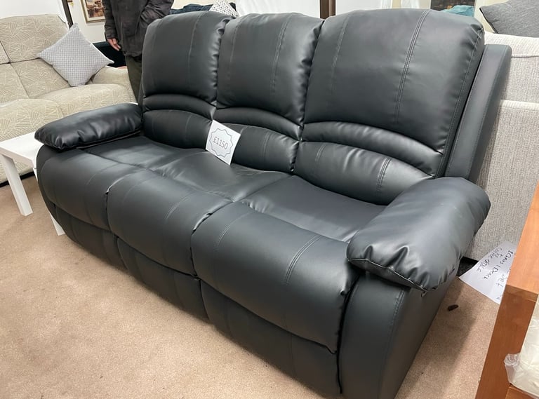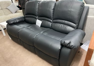 Luxurious grey faux leather three-seater with reclining functionality, padded armrests, and contrast stitching for modern comfort.