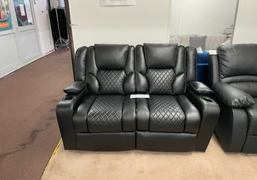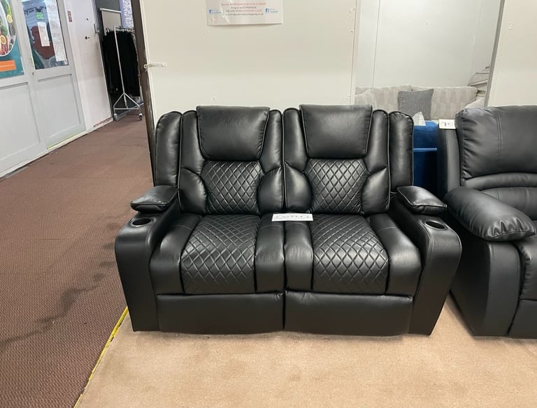 Plush grey faux leather two-seater recliner featuring integrated cup holders, generously padded cushioning, and contrast stitching for ultimate relaxation.