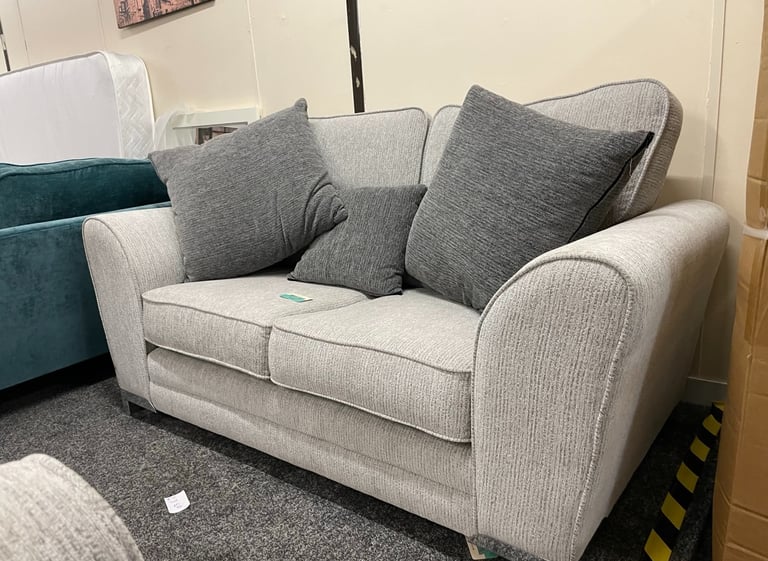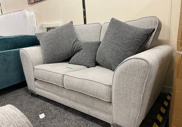 Contemporary light grey two-seater with textured chenille-style fabric, rounded arms, and plush scatter cushions in coordinating charcoal tones.