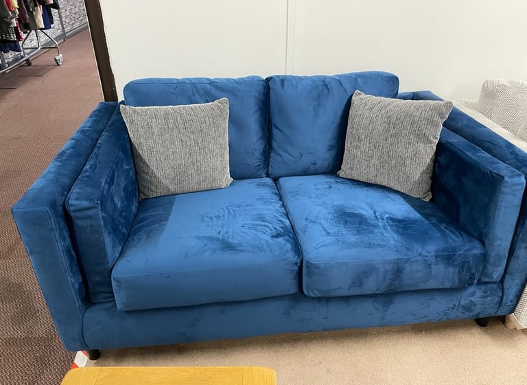 Luxurious navy blue velvet three-seater with deep button-tufted cushioning, low profile arms, and coordinating scatter cushions for a rich, contemporary look.